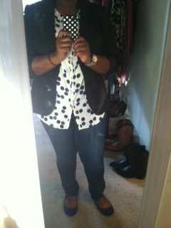 Actually excited to wear jeans to work today. New blue shoes (Qupid-c/o Blush Boutique) and polka dot top (c/o New York & Company). Jeans from Old Navy and Blazer from Anne Taylor finish it off along with a Target Merona Watch. Oh and my phone case is from Verizon; not the Kate Spade case though still quite cute and more economical.